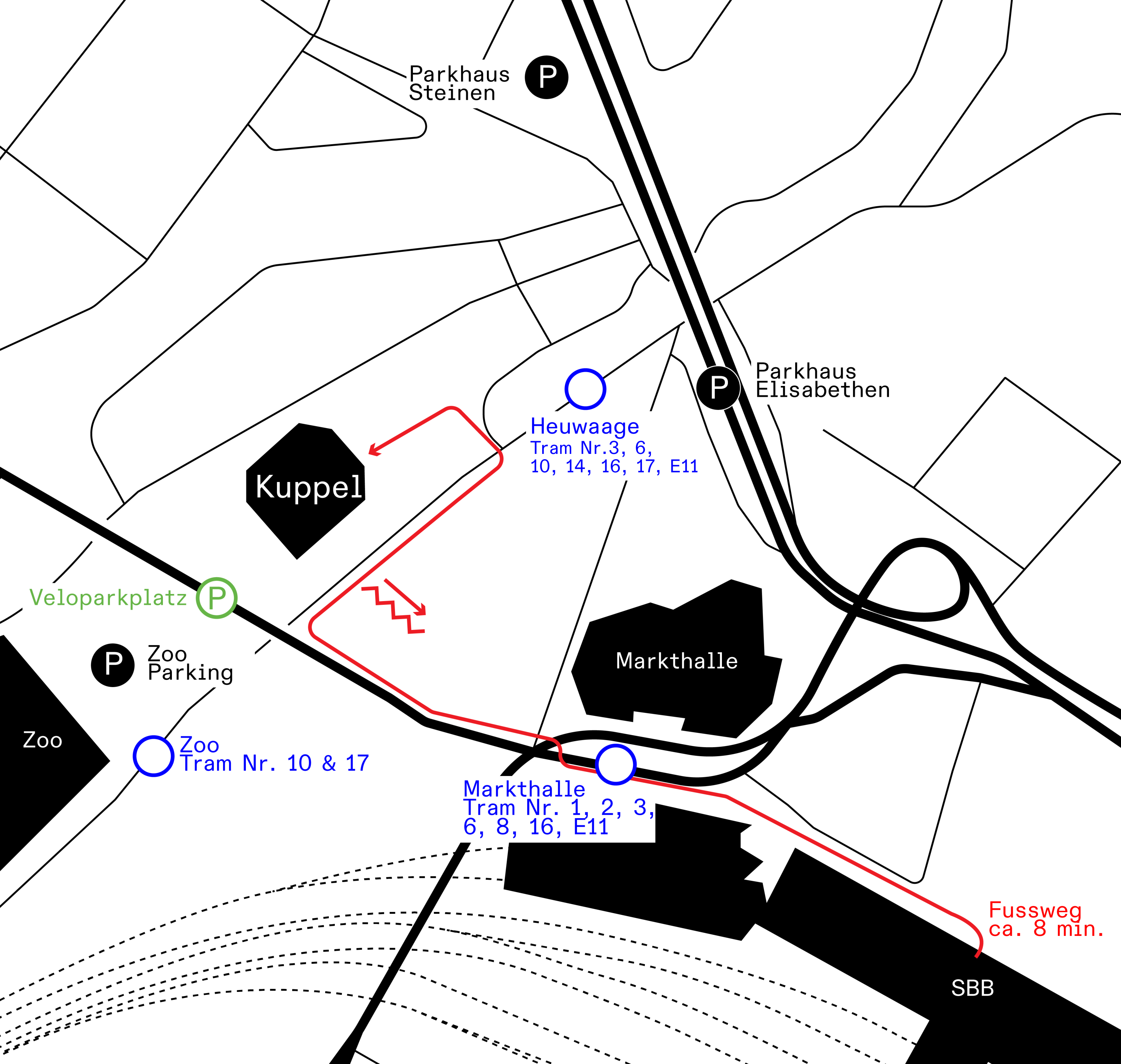 Die Tram-Stationen «Heuwaage», «Zoo» / «Zoo Bachletten» sowie «Markthalle» befinden sich in unmittelbarer Nähe der Kuppel Basel.